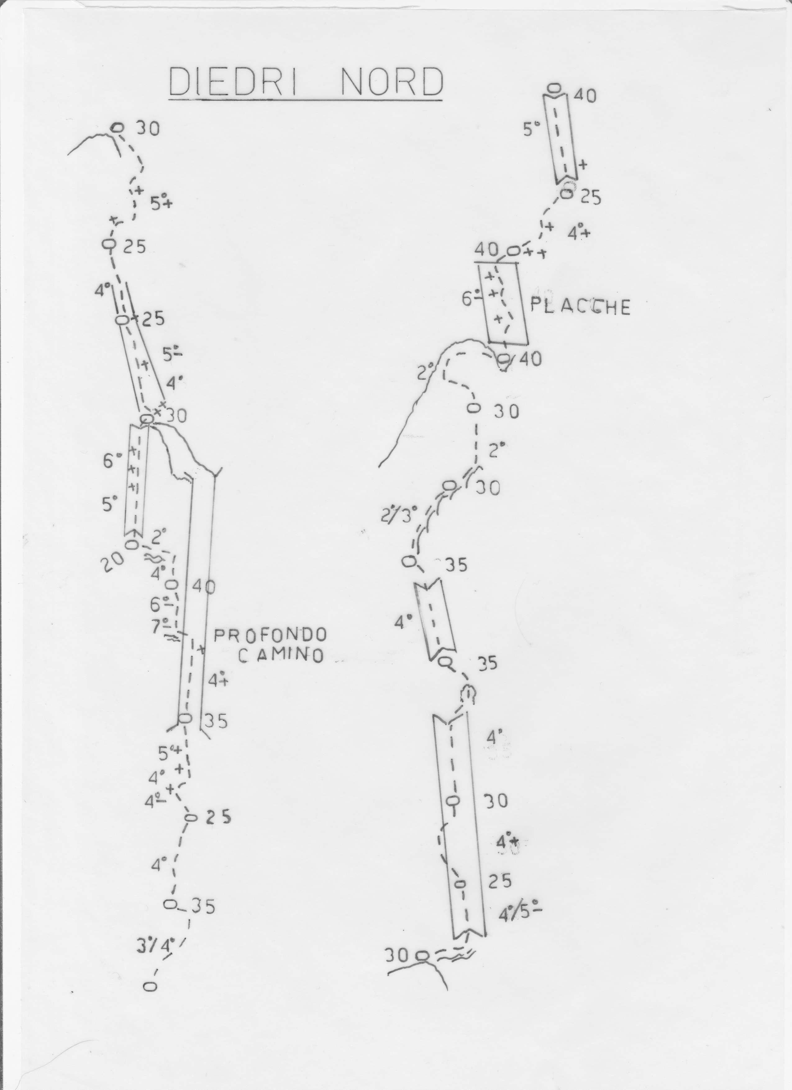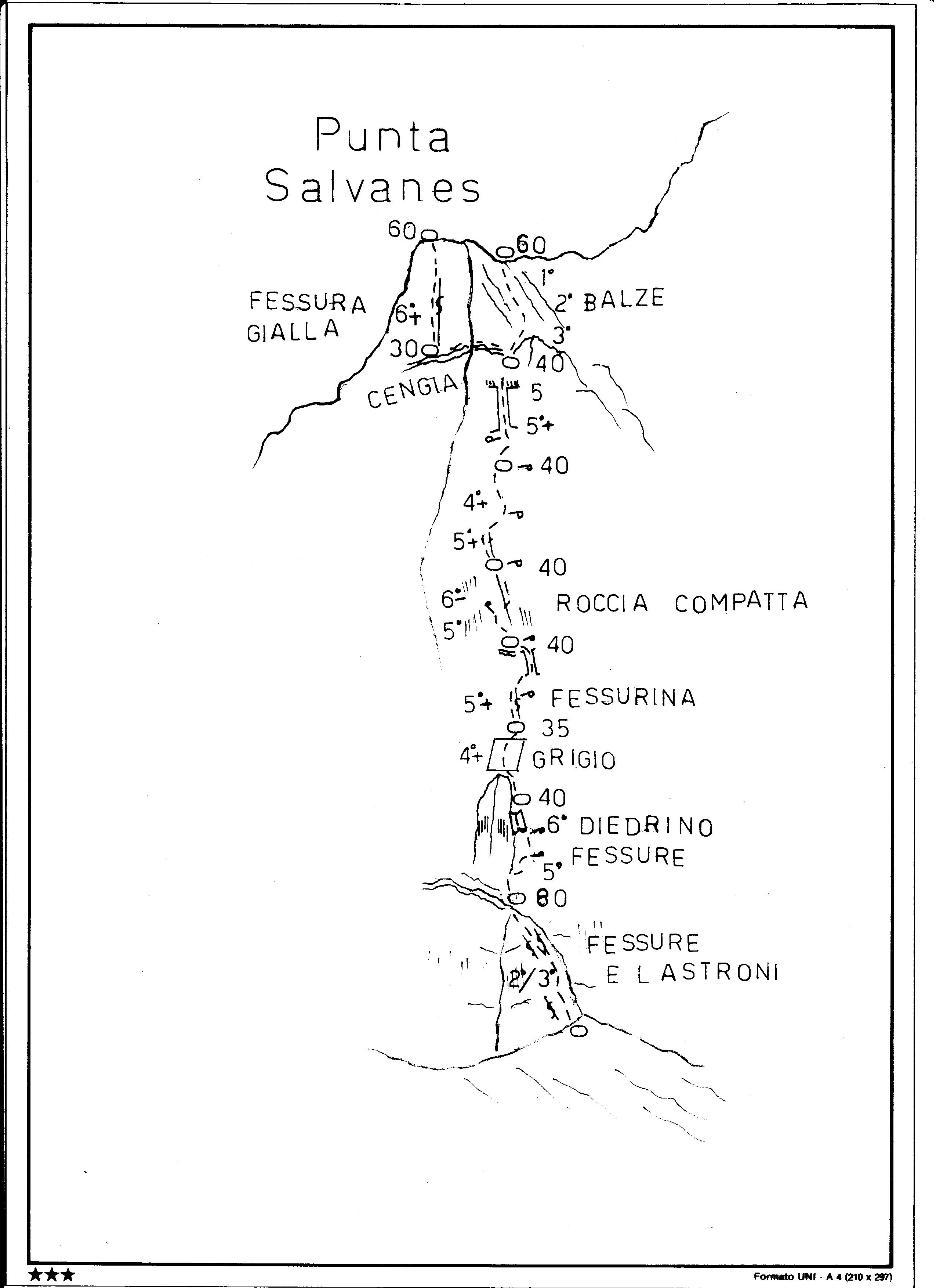 Per la precisione, quindi, sulla foto risultano i seguenti itinerari, da sin. a dx.:1) Via Bernard-Vigo alla Punta Salvanes ( relazionata anche da Furlani; via sufficientemente chiodata e già ripetuta ) del 1989, con variante diretta sulla sinistra ( non ripetuta )- 2) percorso molto probabile della via Piaz e compagni 1912, con la possibilità di deviare a metà sui “Diedri Nord”, almeno nel tratto centrale – 3) “Diedri Nord” di Maffei-Bernard ( com. alt.) del 29-7-1977 ( non ripetuta,parzialmente attrezzata ) 4) “Torre dell’Amicizia” , Maffei- Bernard ( com. alt.) del 29/30-7-1977 ( non ripetuta, parzialmente attrezzata).