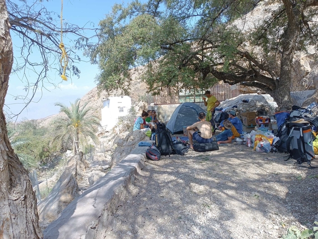 Complessivamente in questi primi giorni la roccia non convince, c’è un po’ di scetticismo nel gruppo e forse un pizzico di delusione iniziale, per cui decidiamo di spostarci verso l’area che fin da casa sembrava riservare il più alto potenziale, lo Jabel Kawr e lo Jabel Misht. Soprattutto su quest’ultimo riponevamo grandi aspettative in quanto eravamo interessati ad una via del grande Auer, ma da subito abbiamo capito che non sarebbe stato possibile ripeterla. La parete, alta 1000 m prende sole dalle 7 alle 18 e di giorno si arrivava a oltre 30 gradi, una combinazione improponibile viste anche le difficoltà della via.